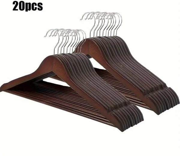 Organize your wardrobe in style with this premium 20-pack of wooden hangers, crafted for durability and elegance. Each hanger features a smooth finish and a sturdy pants bar, making it perfect for hanging suits, shirts, jackets, pants, and dresses. Designed with a slim profile to save space while keeping your clothes wrinkle-free and in perfect shape.